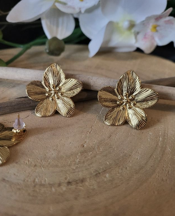 Paire de Boucles d’oreilles Fleur, en acier inoxydable de couleur dorée, accompagné d’un fermoir, modèle fleur décontracté et tendance qui s’adaptera parfaitement selon vos envies et vos tenues vestimentaires. 15g