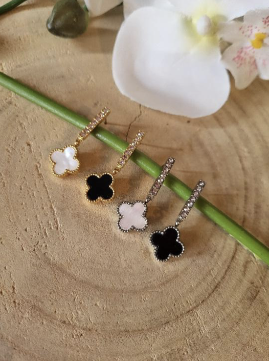 Paire de Boucles d’oreilles Pauline, en acier inoxydable de couleur argentée ou dorée noir ou blanc nacré, modèle trèfle à quatre feuilles, style simple et tendance qui s’adaptera parfaitement selon vos envies et vos tenues vestimentaires. 10g