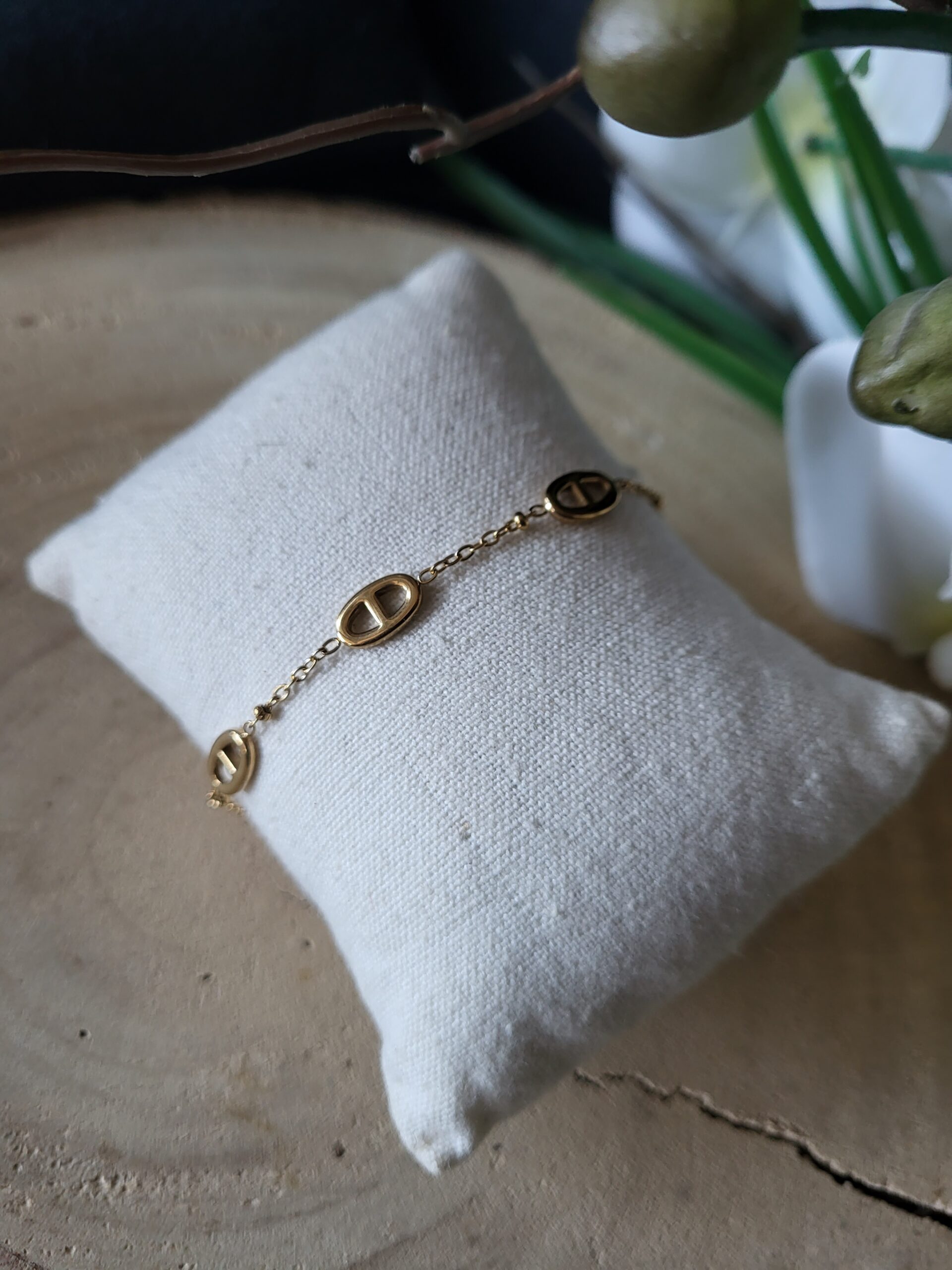 Bracelet Amandine, en acier inoxydable de couleur doré, modèle nez de cochon, 16 cm plus 5 cm de rajout qui s’adaptera parfaitement selon vos envies et vos tenues vestimentaires. 20g